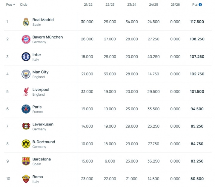 第1-第10:皇马、拜仁、国米、曼城、利物浦、巴黎、勒沃库森、多特、巴萨、罗马